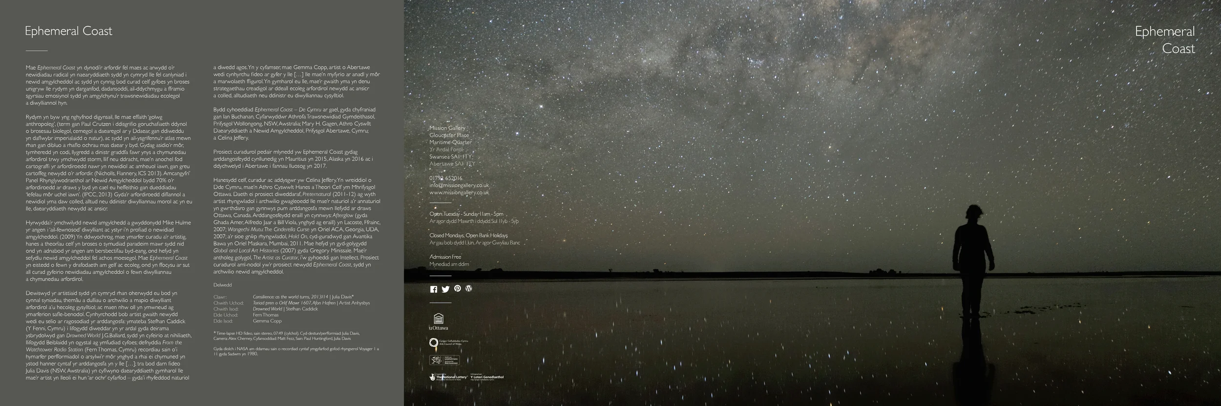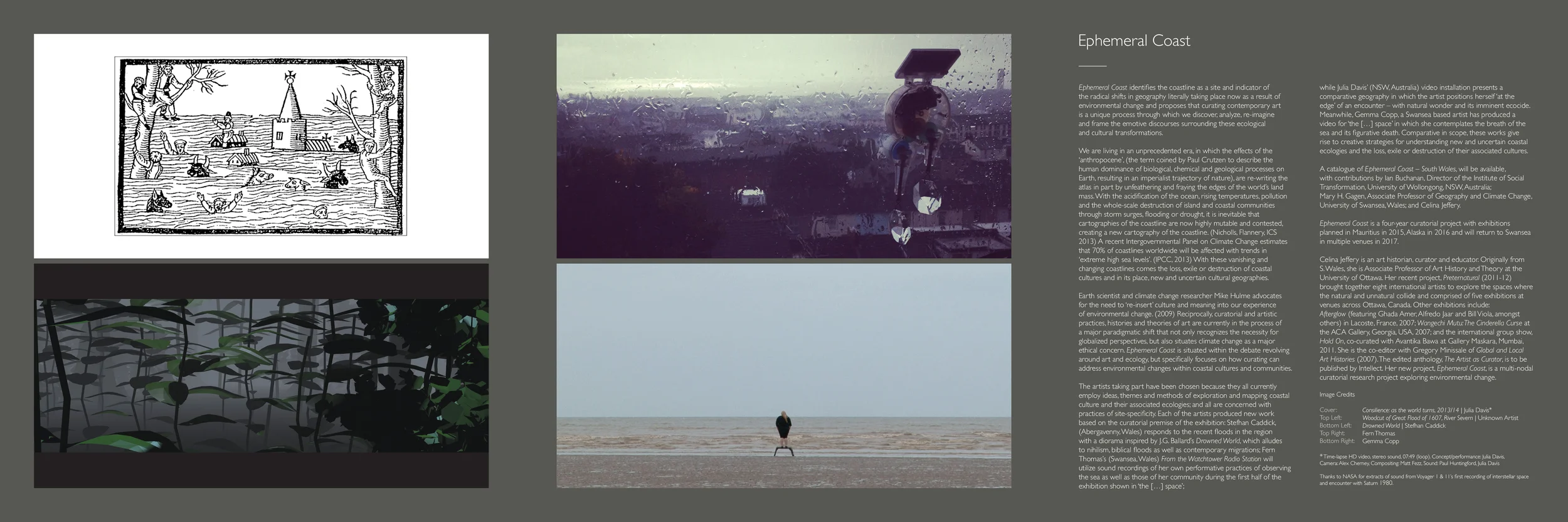 A catalogue of Ephemeral Coast – S. Wales will be published by punctum.books with contributions by Ian Buchanan, Director of the Institute of Social Transformation, University of Wollongong, NSW, Australia; Mary H. Gagen, Associate Professor of Geography and Climate Change, Swansea University and C3W; and Celina Jeffery.